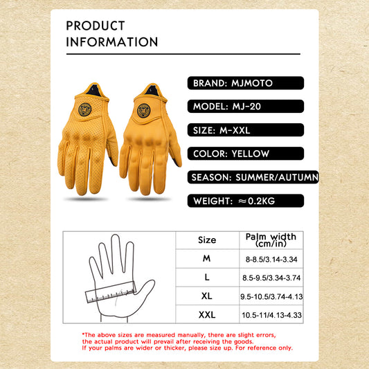 Retro Yellow Leather Motorcycle Gloves Men Women Breathable Perforated Motorbike Racing Gloves Touch Screen Motocross Moto Glove